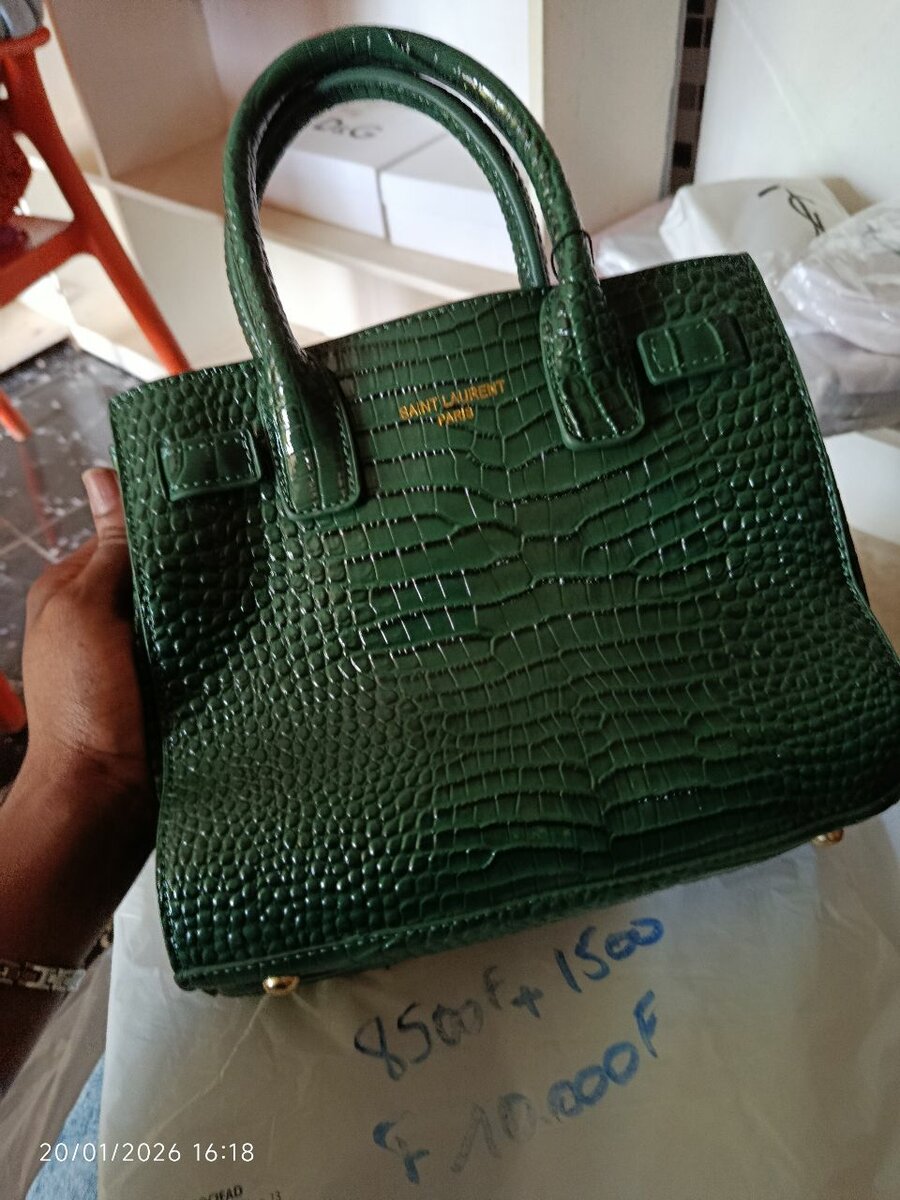 Sac à main luxueux en cuir vert, fabriqué à partir de cuir de crocodile, avec des détails dorés. Parfait pour les occasions spéciales ou le quotidien.