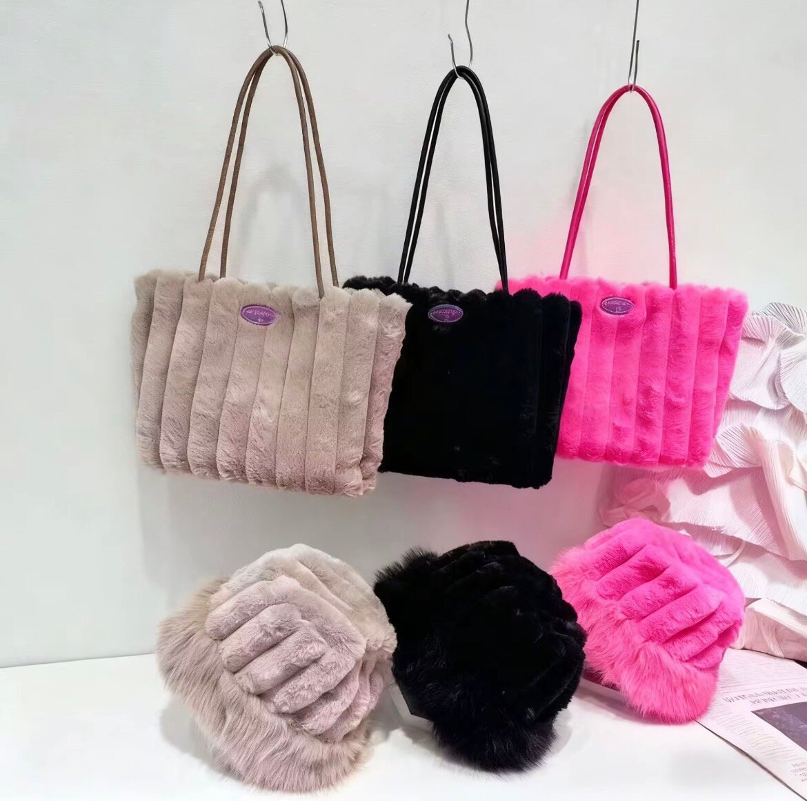 Sac à main élégant et chaud en fourrure synthétique. Léger et spacieux, parfait pour l'hiver. Disponible en beige, noir et rose.