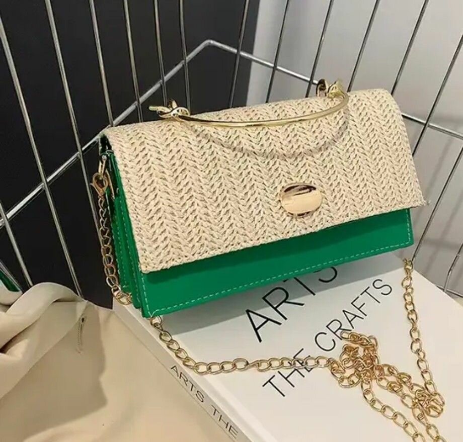 Élégant sac à main en paille avec anse dorée et détails verts. Parfait pour un look estival ou une soirée, ce sac ajoute une touche de sophistication naturelle à toute tenue. Compact mais spacieux pour vos essentiels quotidiens.