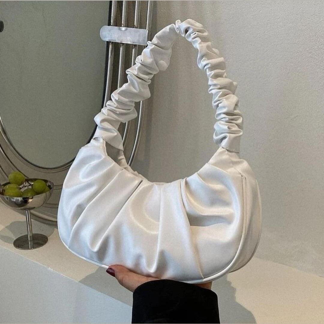 Ce sac à main en satin blanc est l'accessoire parfait pour compléter votre look élégant. Conçu avec une poignée froncée chic, il apporte une touche de sophistication à toute tenue. Idéal pour les occasions spéciales ou une sortie en soirée, son design spacieux vous permet de transporter tous vos essentiels avec style.