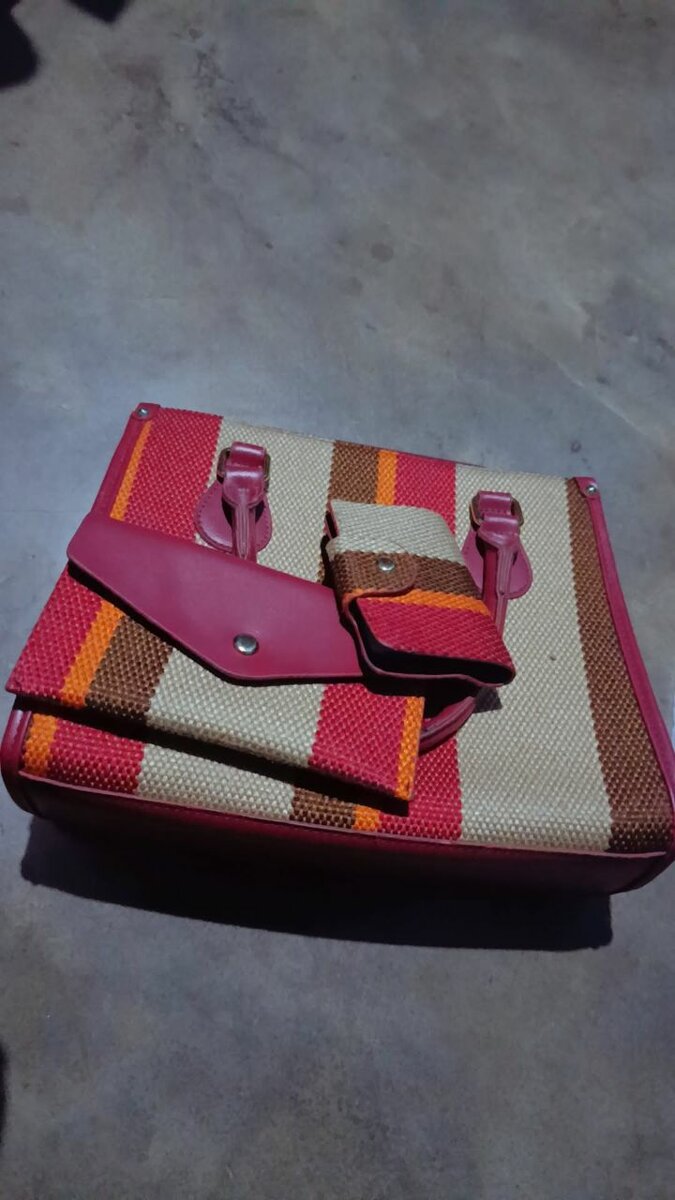 Sac à main en toile rayée rouge et beige, avec fermoirs et détails en cuir. Idéal pour les femmes qui cherchent un accessoire élégant et pratique.