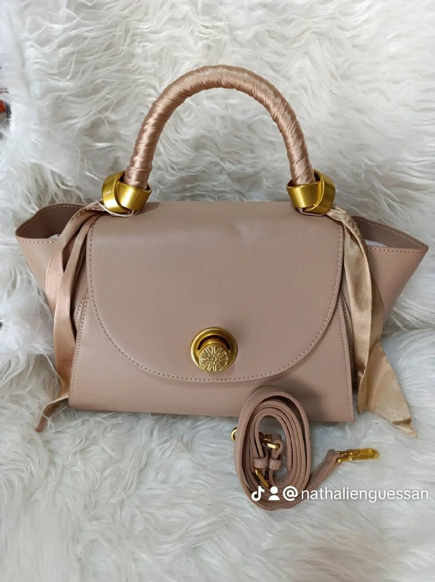 Sac à main en cuir beige de luxe pour femme, avec poignée et bandoulière amovible. Design élégant et raffiné, idéal pour les occasions spéciales ou le quotidien.