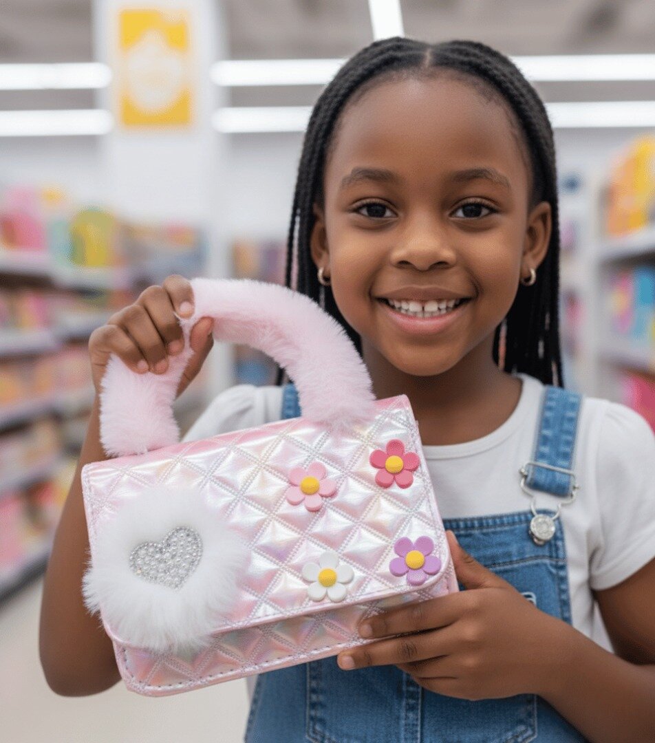 Ce sac à main rose avec une poignée en peluche est l'accessoire idéal pour les petites fashionistas. Paré de fleurs colorées et d'un cœur scintillant, il apporte une touche de féerie à toute tenue. Parfait pour les sorties et les occasions spéciales.