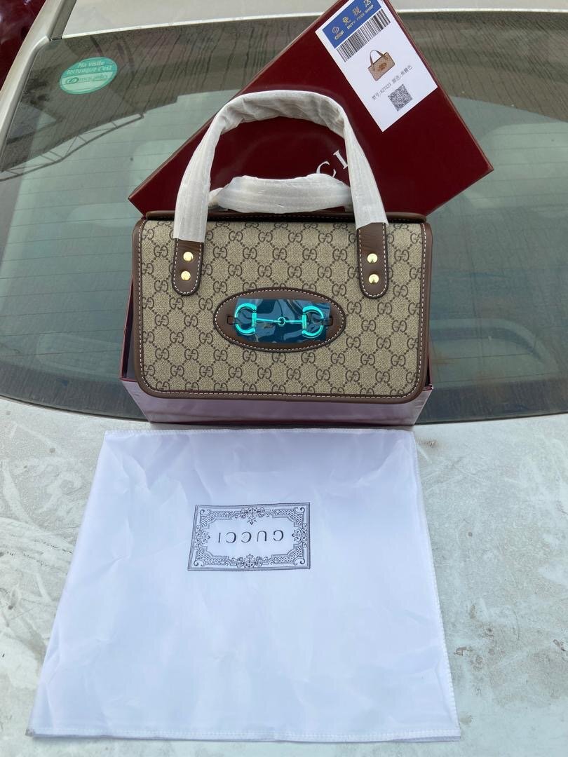 Sac à main Gucci en cuir marron avec logo bleu. Conçu pour les femmes élégantes, il est parfait pour des occasions spéciales ou une utilisation quotidienne.