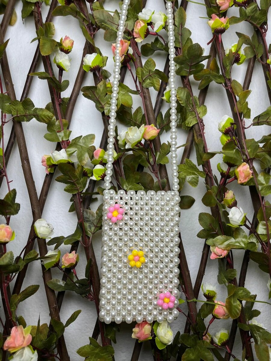 Élégant sac à main en perles blanches avec détails floraux. Parfait pour des occasions spéciales ou une tenue chic.