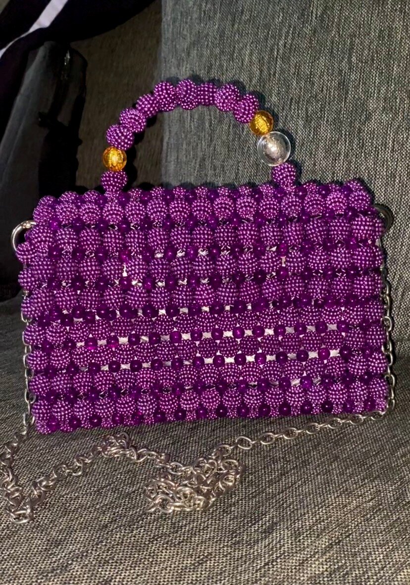 Optez pour ce sac à main en perles violet, parfait pour ajouter une touche d'élégance à vos tenues. Fabriqué à la main avec une chaîne argentée, il convient pour des sorties ou des événements spéciaux. Compact et chic, il est facile à assortir avec divers styles vestimentaires.