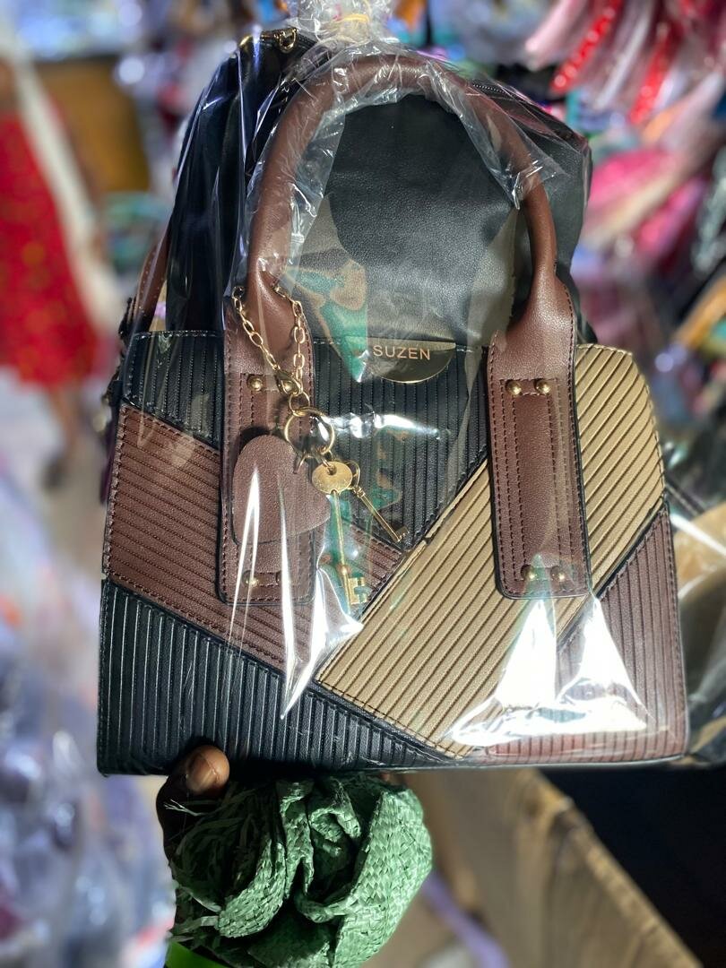 Sac à main élégant de la marque SUZEN, fabriqué en cuir marron de haute qualité. Design moderne avec des accents en cuir noir et beige. Fermeture sécurisée avec une chaîne dorée et une clé décorative. Idéal pour les femmes qui cherchent un accessoire de mode pratique et stylé.