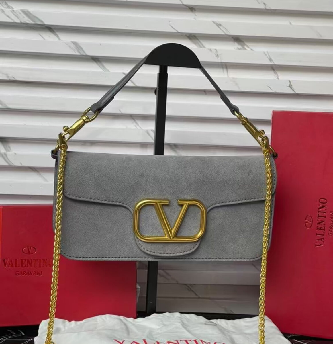 Élégant sac à main Valentino en daim gris avec détails en or. Parfait pour les occasions spéciales ou pour ajouter une touche de luxe à votre tenue quotidienne.
