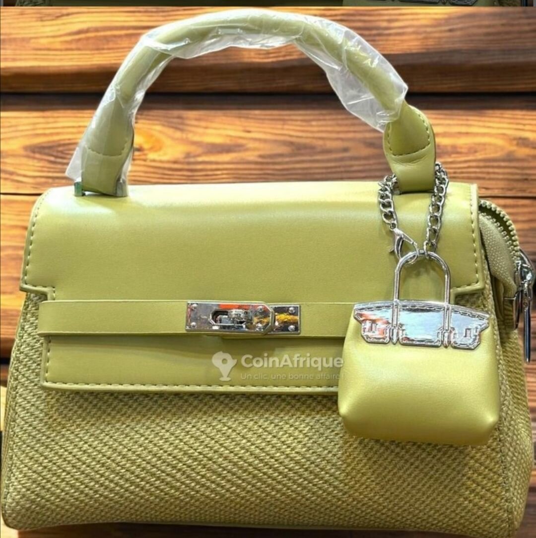 Sac à main en cuir vert avec chaîne et cadenas, fermeture éclair latérale, poignée rigide. Élégant et pratique pour un usage quotidien ou soirée.
