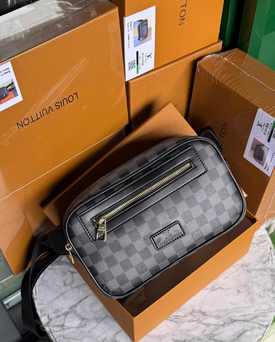 Sac banane Louis Vuitton en toile grise à motif damier. Fermeture éclair dorée et détails en cuir. Sangle ajustable. Élégant et pratique pour un usage quotidien.