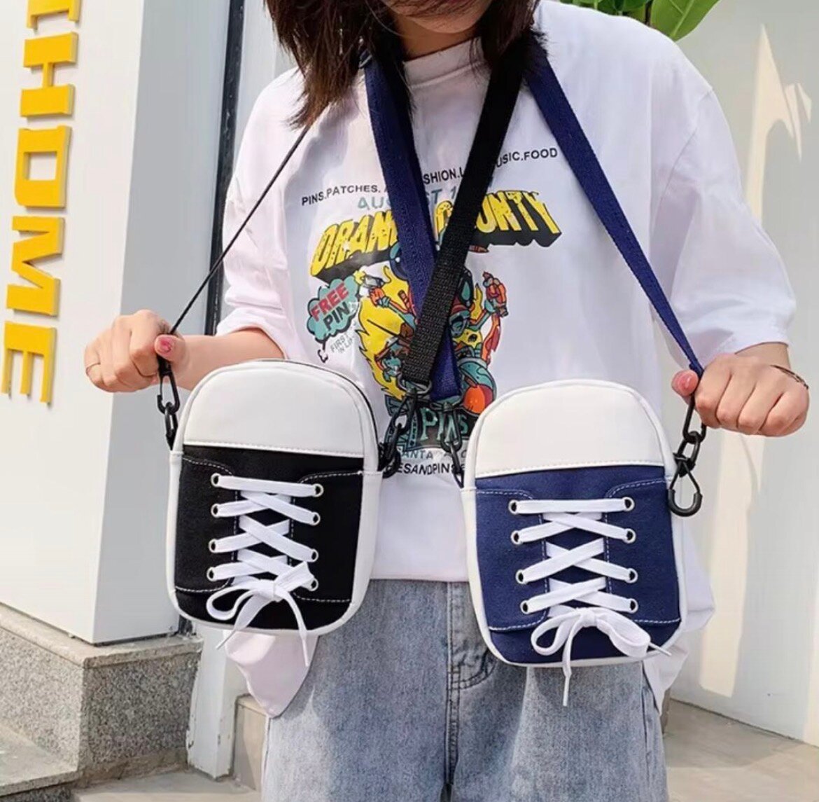 Découvrez le sac bandoulière original en forme de baskets. Parfait pour les amateurs de mode urbaine, il est idéal pour transporter vos essentiels avec style. Design unique avec cordons imitant les lacets, ce sac attire tous les regards. Léger et pratique, il s'accorde facilement avec vos tenues décontractées.