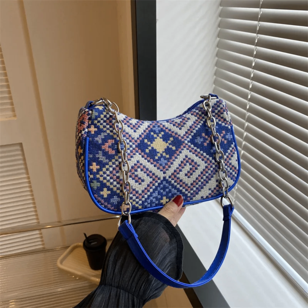 Optez pour ce sac bandoulière au style bohème avec ses motifs géométriques bleus et blancs. Idéal pour ajouter une touche élégante et unique à votre tenue. Parfait pour un usage quotidien ou une sortie décontractée. Léger et pratique, ce sac est un must pour toute garde-robe tendance.