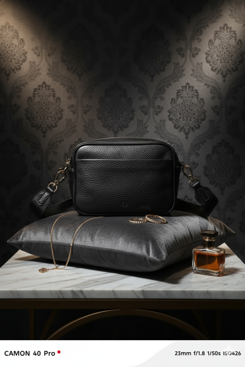Sac bandoulière en cuir noir élégant et pratique. Multiples compartiments avec fermetures éclair pour un rangement optimal. Idéal pour les sorties en ville ou les voyages.
