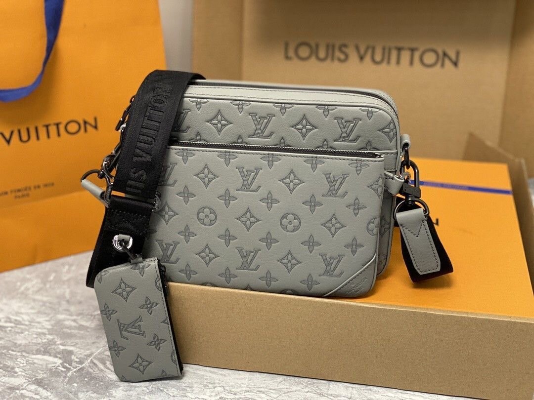 Sac bandoulière Louis Vuitton de couleur gris, avec motif monogrammé. Conçu pour les hommes modernes, il offre un style élégant et une fonctionnalité exceptionnelle.