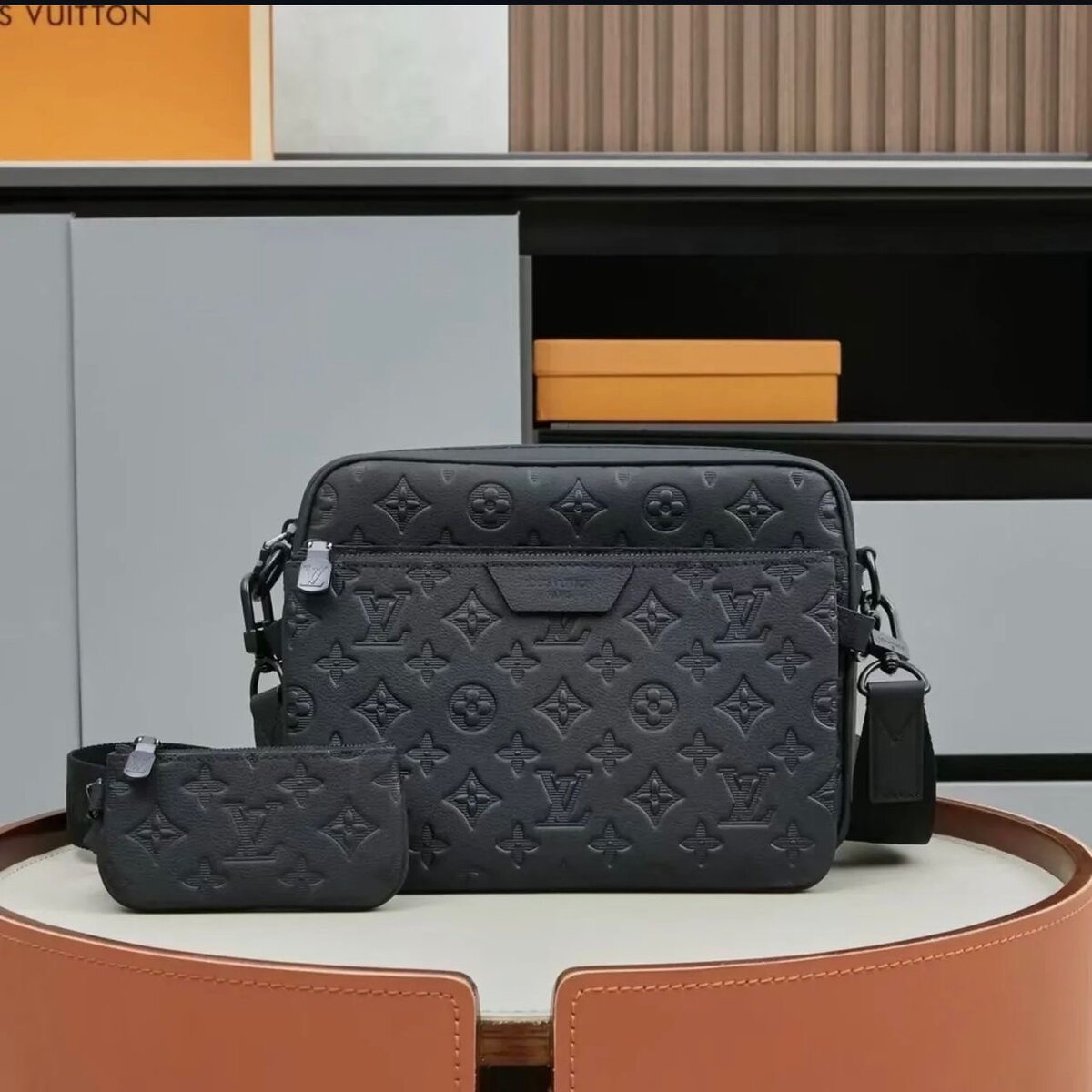 Sac bandoulière Louis Vuitton en cuir noir avec motif monogrammé. Design élégant et pratique avec plusieurs compartiments. Idéal pour un usage quotidien.