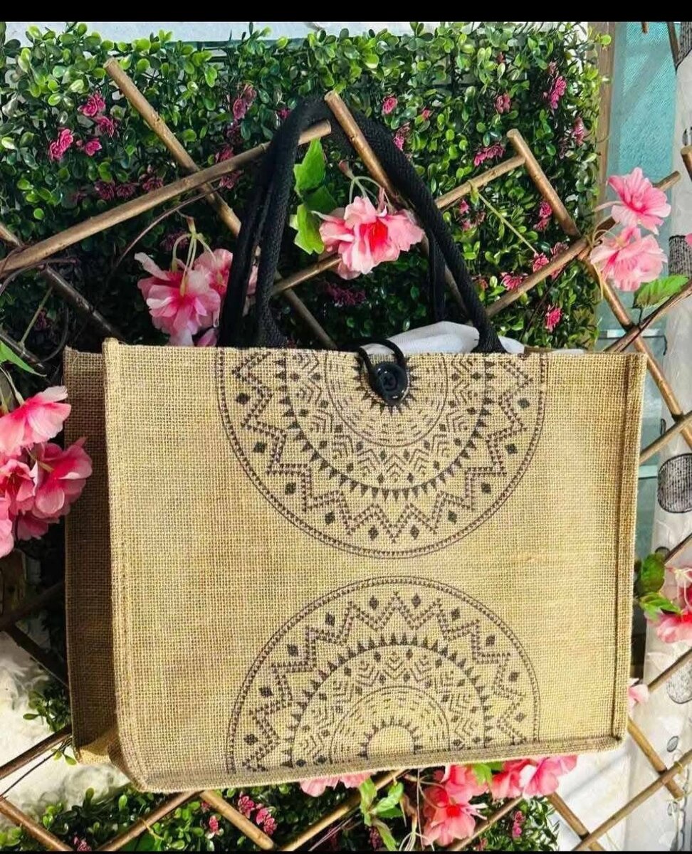 Découvrez ce magnifique sac en sac cabas en toile de jute de 40 cm d'un motif mandala ethnique. Idéal pour vos sorties quotidiennes il allie style et praticité. Fabriqué en matériau durable, il offre suffisamment d'espace pour ranger vos essentiels tout en ajoutant une touche bohème à votre look. C'est le choix parfait pour celles qui cherchent un accessoire unique et écologique. Parfait pour le shopping, la plage, l'école, le boulot, ou une promenade en ville.