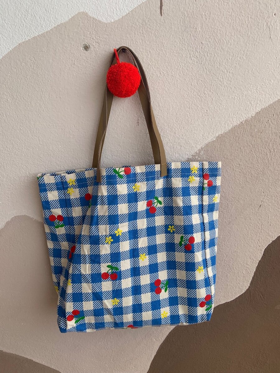 Ce sac cabas à carreaux bleus et blancs est parfait pour vos sorties quotidiennes. Avec ses motifs colorés et sa décoration pompon rouge, il allie style et praticité. Spacieux et robuste, il est idéal pour le shopping ou la plage.