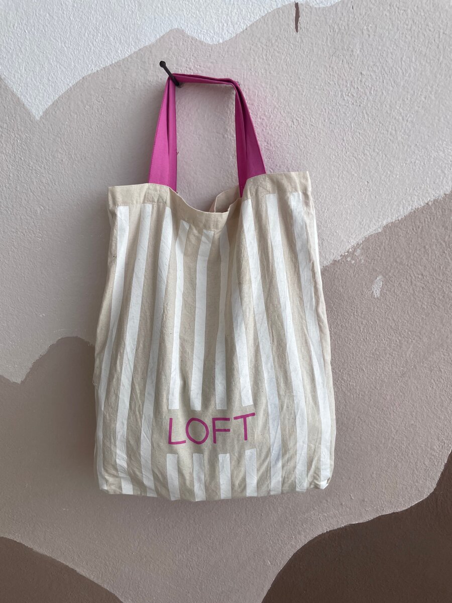 Ce sac cabas en tissu rayé avec poignées roses est idéal pour vos courses ou sorties quotidiennes. Résistant et stylé, il ajoute une touche de couleur à votre tenue.