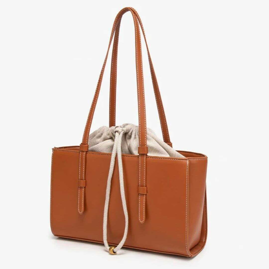 Sac cabas élégant en cuir marron avec intérieur en tissu beige. Design moderne et pratique avec poignées et cordon de serrage. Idéal pour un usage quotidien.