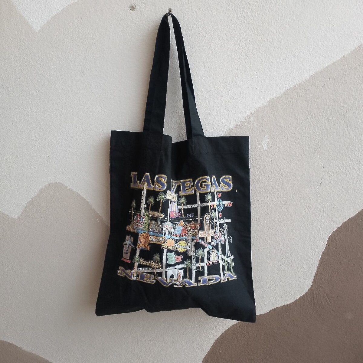 Sac cabas en toile noir avec imprimé Las Vegas. Parfait pour les courses ou une sortie décontractée. Solide et pratique, il donne une touche urbaine à votre style. Idéal pour les fans de la ville mythique et de ses lumières.