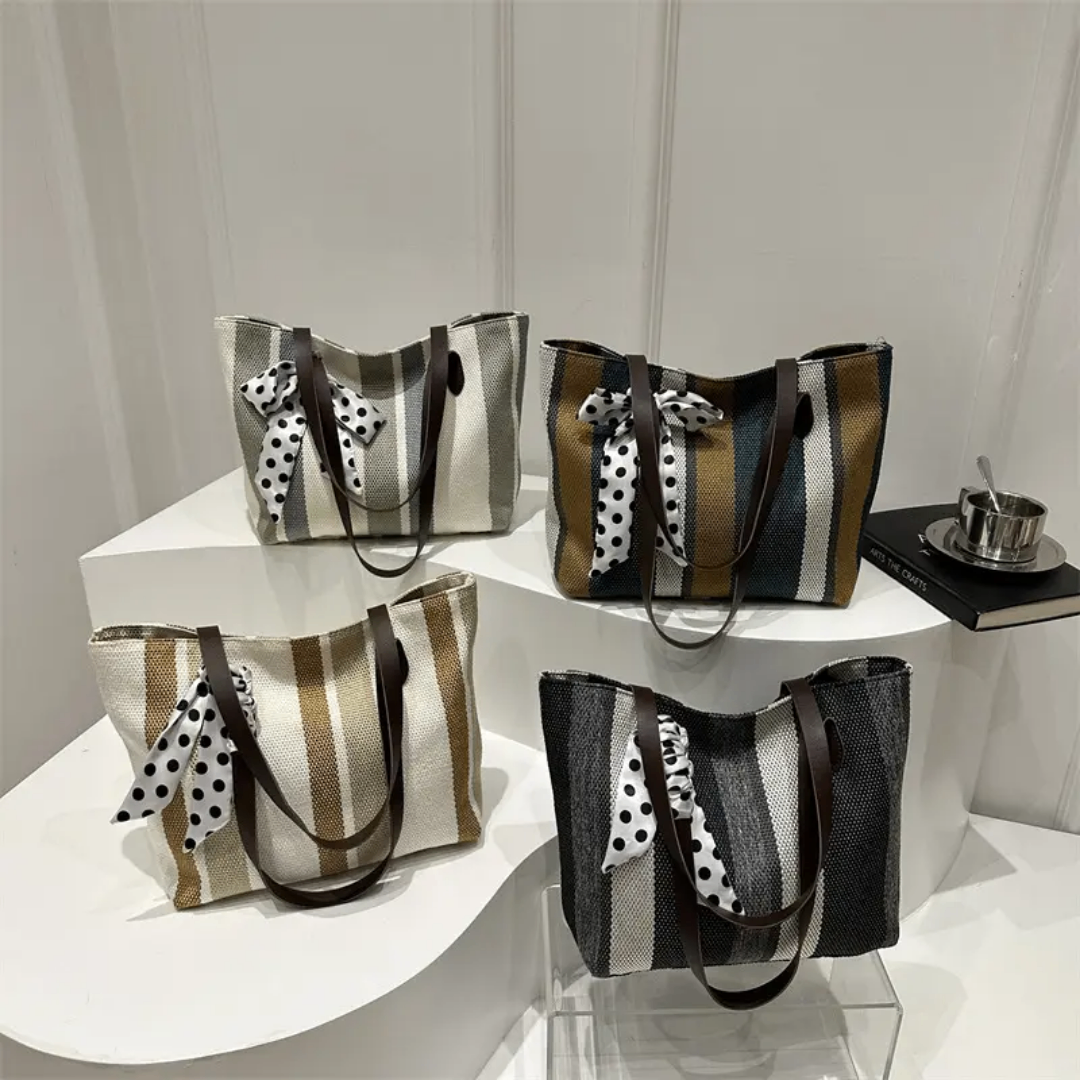 Découvrez notre sac cabas en toile rayée, sublimé par un nœud à pois raffiné. Parfait pour rehausser votre look ou pour une journée entre nombreuses courses