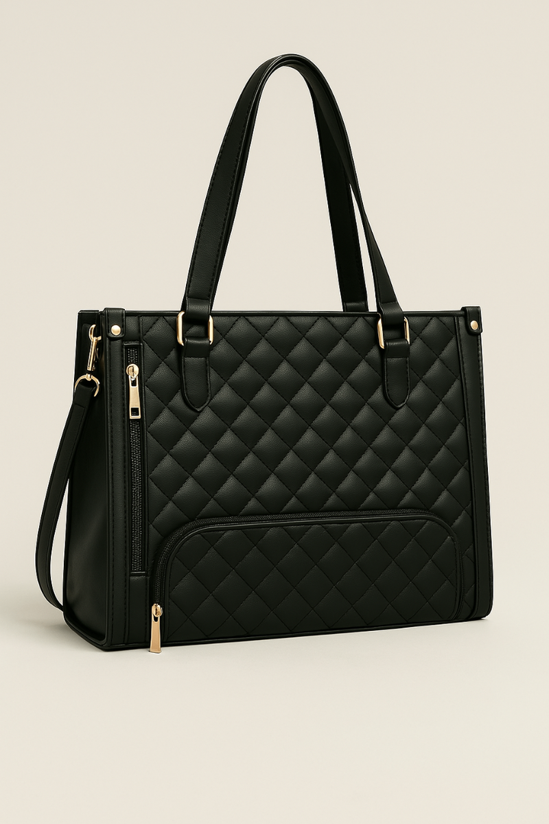 Élégant sac cabas en cuir noir matelassé, idéal pour un usage quotidien.
