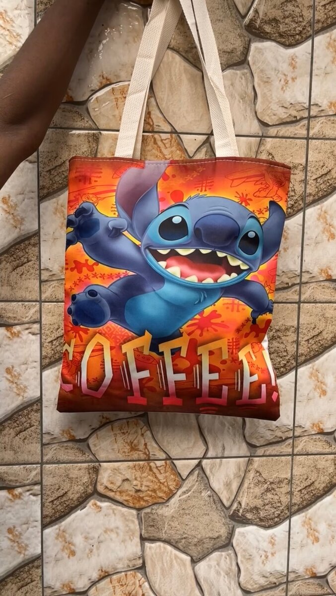 Sac cabas en toile avec impression Stitch buvant du café. Parfait pour les fans de Disney, résistant et spacieux. Idéale pour courses, plage ou travail.