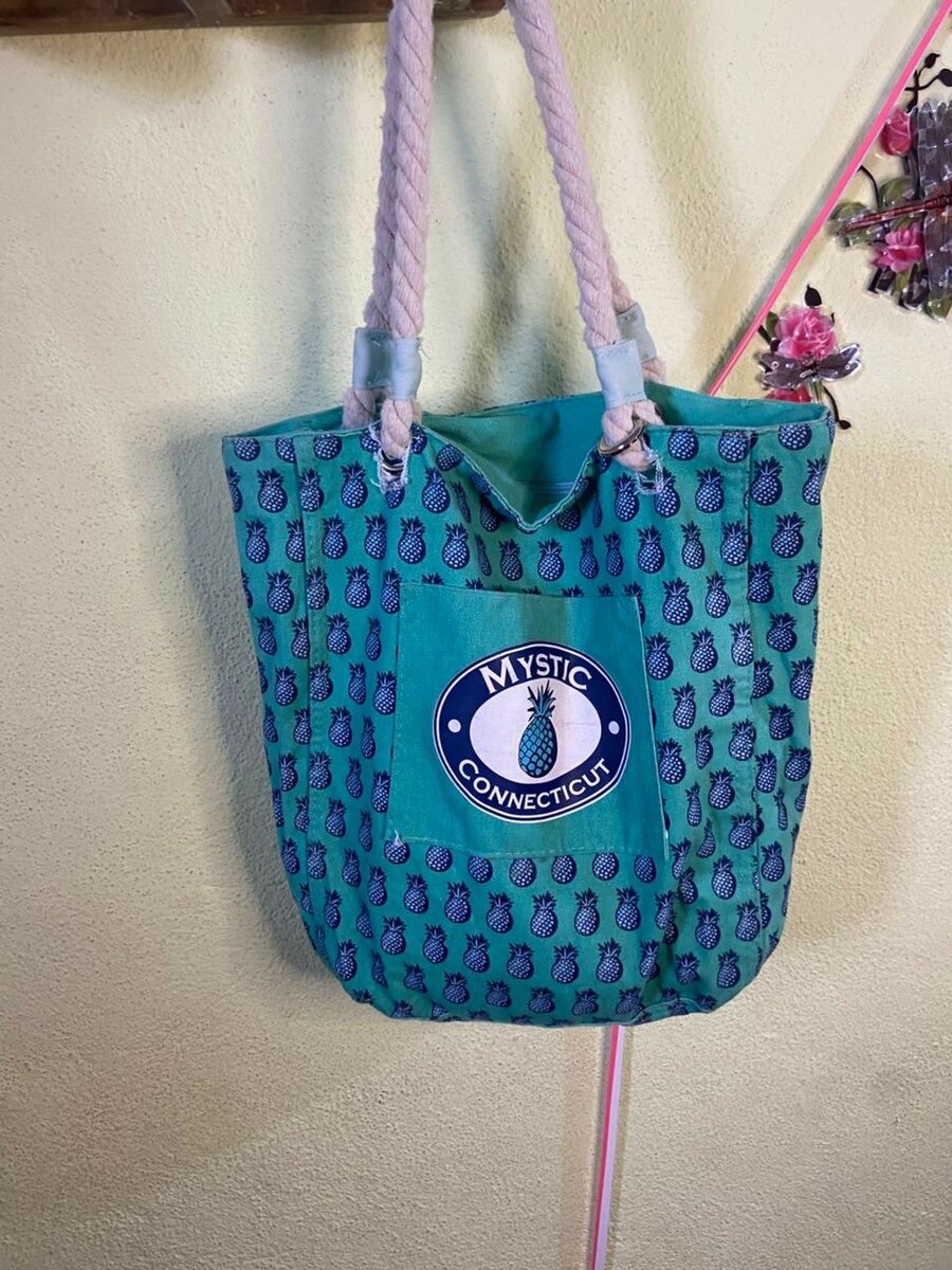Découvrez ce sac de plage tendance de Mystic Connecticut, orné d'un motif ananas vibrant et équipé de poignées en corde robustes. Parfait pour transporter tous vos essentiels de plage avec style. Fabriqué en matériau léger et durable, il est idéal pour vos journées ensoleillées ou vos balades en ville.