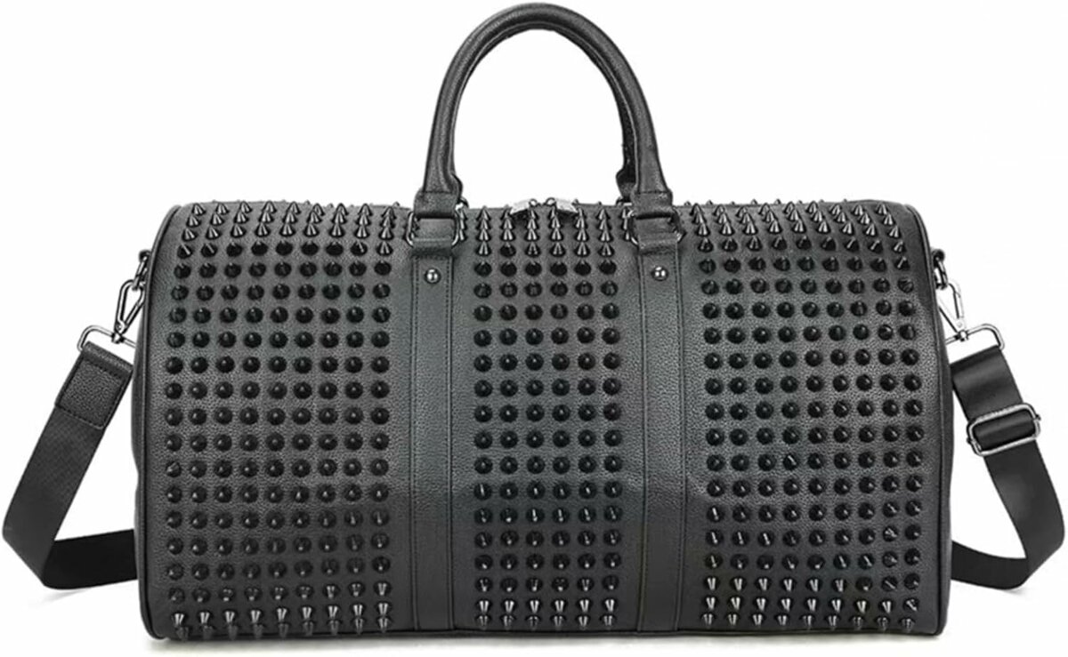 Découvrez ce sac de voyage clouté noir, parfait pour allier style et praticité. Fabriqué avec des matériaux de haute qualité, il offre durabilité et espace suffisant pour tous vos besoins lors de voyages ou de sorties. Son design audacieux avec des clous apporte une touche unique. Idéal pour ceux qui cherchent à se démarquer avec élégance.