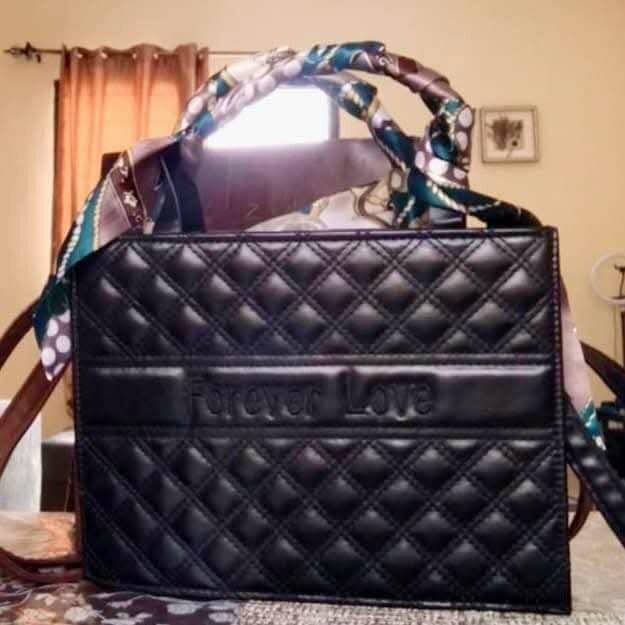 Découvrez le sac en cuir "Forever Love" avec un design matelassé élégant et des poignées en foulard. Parfait pour toutes les occasions, il combine style et fonctionnalité. Idéal pour ajouter une touche chic à votre tenue.