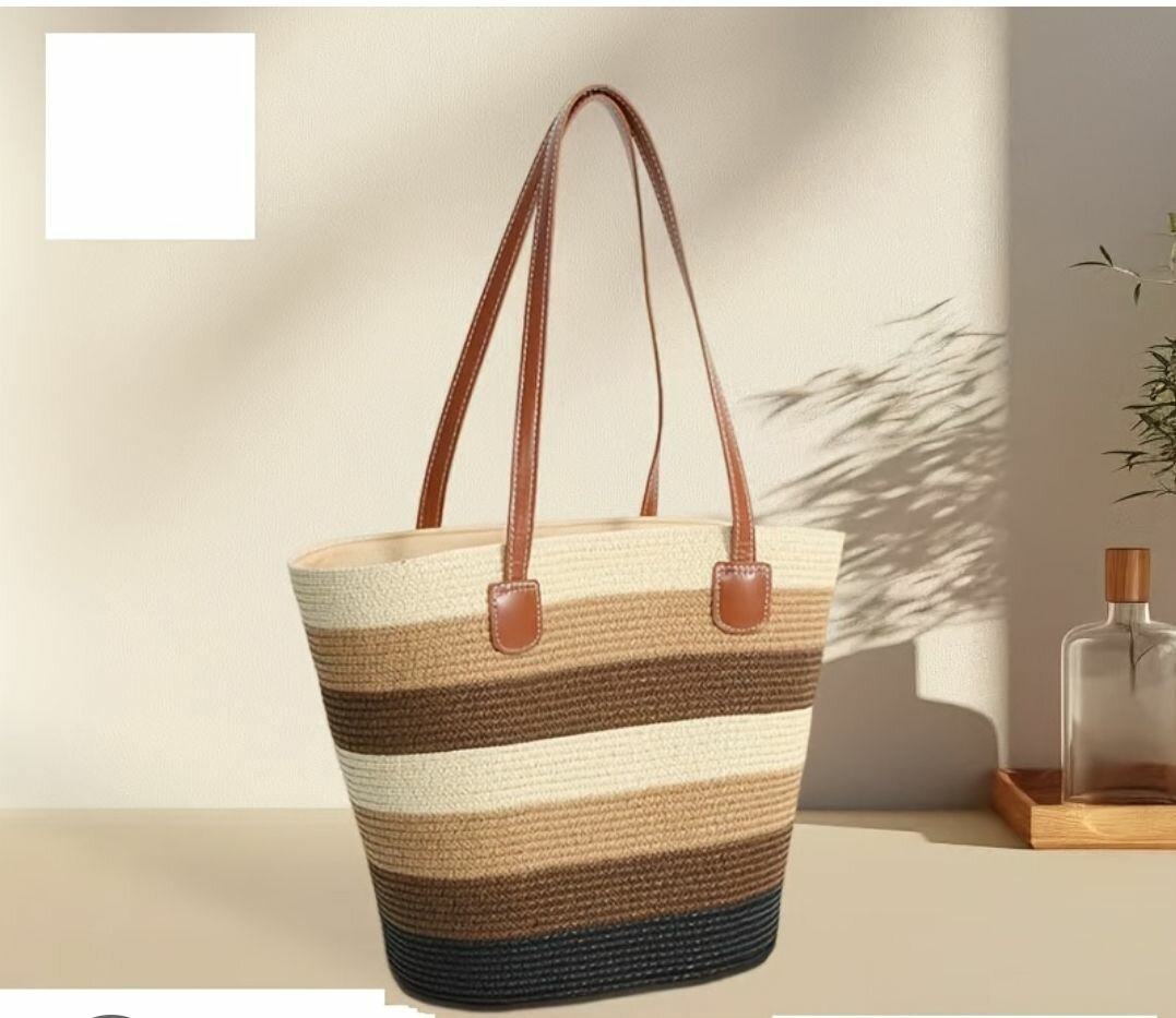 Découvrez ce sac fourre-tout élégant et pratique, idéal pour toutes vos sorties. Fabriqué en matière durable avec des rayures intemporelles, il est non seulement spacieux mais aussi à la mode. Ses poignées en cuir synthétique ajoutent une touche de sophistication. Parfait pour une journée à la plage ou une promenade en ville, ce sac est votre compagnon indispensable.