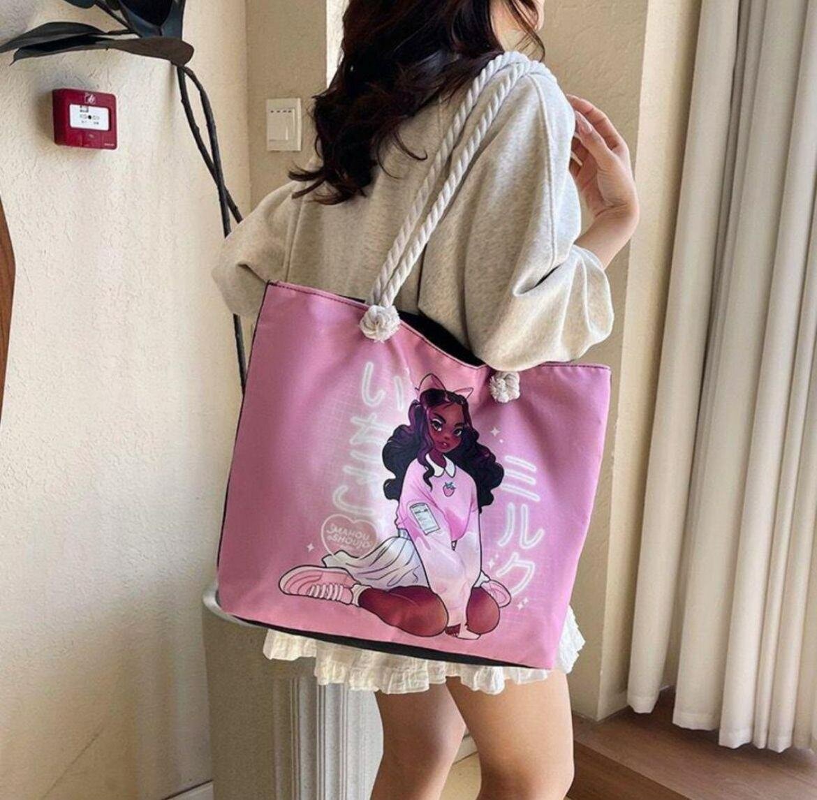 Découvrez ce sac fourre-tout rose illustré, idéal pour les sorties quotidiennes ou un cadeau original. Avec ses poignées en corde et son design unique, il allie style et praticité. Parfait pour transporter vos essentiels avec une touche d'élégance et de créativité. Faites sensation avec cet accessoire incontournable!