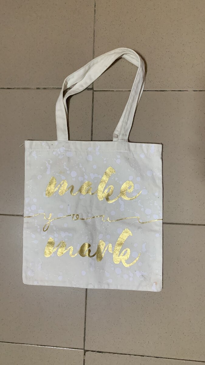 Ce sac fourre-tout en toile, orné d'une citation inspirante en lettres dorées, est parfait pour vos courses ou vos sorties. Fabriqué à partir de matériaux durables, il offre un espace généreux et des anses confortables. Idéal pour un usage quotidien ou comme accessoire tendance.