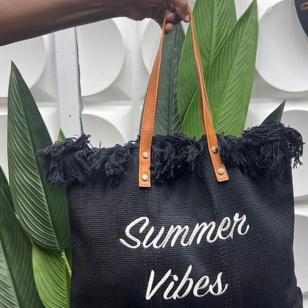 Découvrez le sac fourre-tout parfait pour un été stylé ! Fabriqué avec soin, ce sac noir arbore l'inscription "Summer Vibes" en blanc, ajoutant une touche tendance à votre look. Ses poignées marron sont robustes et élégantes, idéales pour vos sorties à la plage ou en ville. Ce sac spacieux est votre compagnon parfait pour transporter toutes vos affaires avec style. Un choix idéal pour les amateurs de mode et les aventureux de l'été!