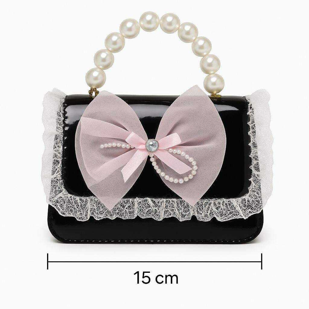 Adorable sac à main pour fille avec poignée en perles, design élégant avec un nœud en ruban. Parfait pour des occasions spéciales ou pour jouer à la princesse. Dimensions: 15 cm.