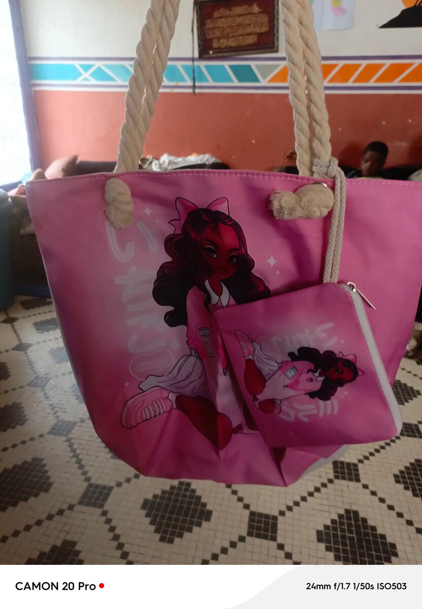 Découvrez notre sac à main rose élégant avec un personnage imprimé unique. Parfait pour les sorties décontractées ou à la plage, ce sac spacieux est accompagné d'une pochette assortie pour vos petits essentiels. Un choix idéal pour ajouter une touche de fun à votre tenue !
