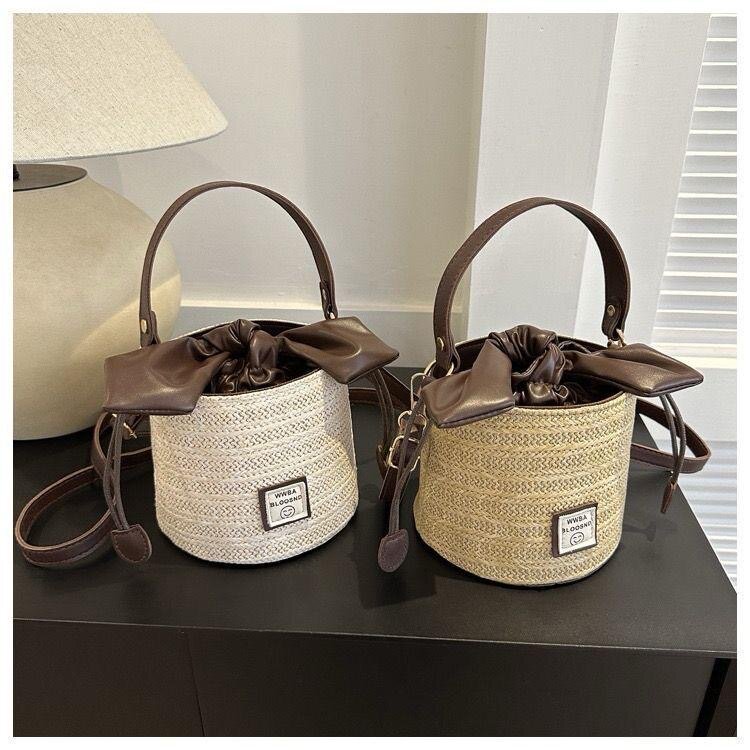 Optez pour ce sac seau en rotin, parfait pour un look chic et décontracté. Avec sa fermeture en tissu et ses détails en cuir, il est idéal pour un usage quotidien ou pour des sorties estivales.