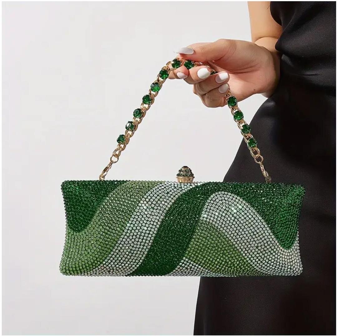 Ajoutez une touche de glamour à votre tenue avec ce sac de soirée étincelant. Conçu avec des strass verts scintillants, il est parfait pour une élégance raffinée. Idéal pour les réceptions, mariages ou sorties nocturnes. Compact et chic, il est l'accessoire ultime pour attirer tous les regards.