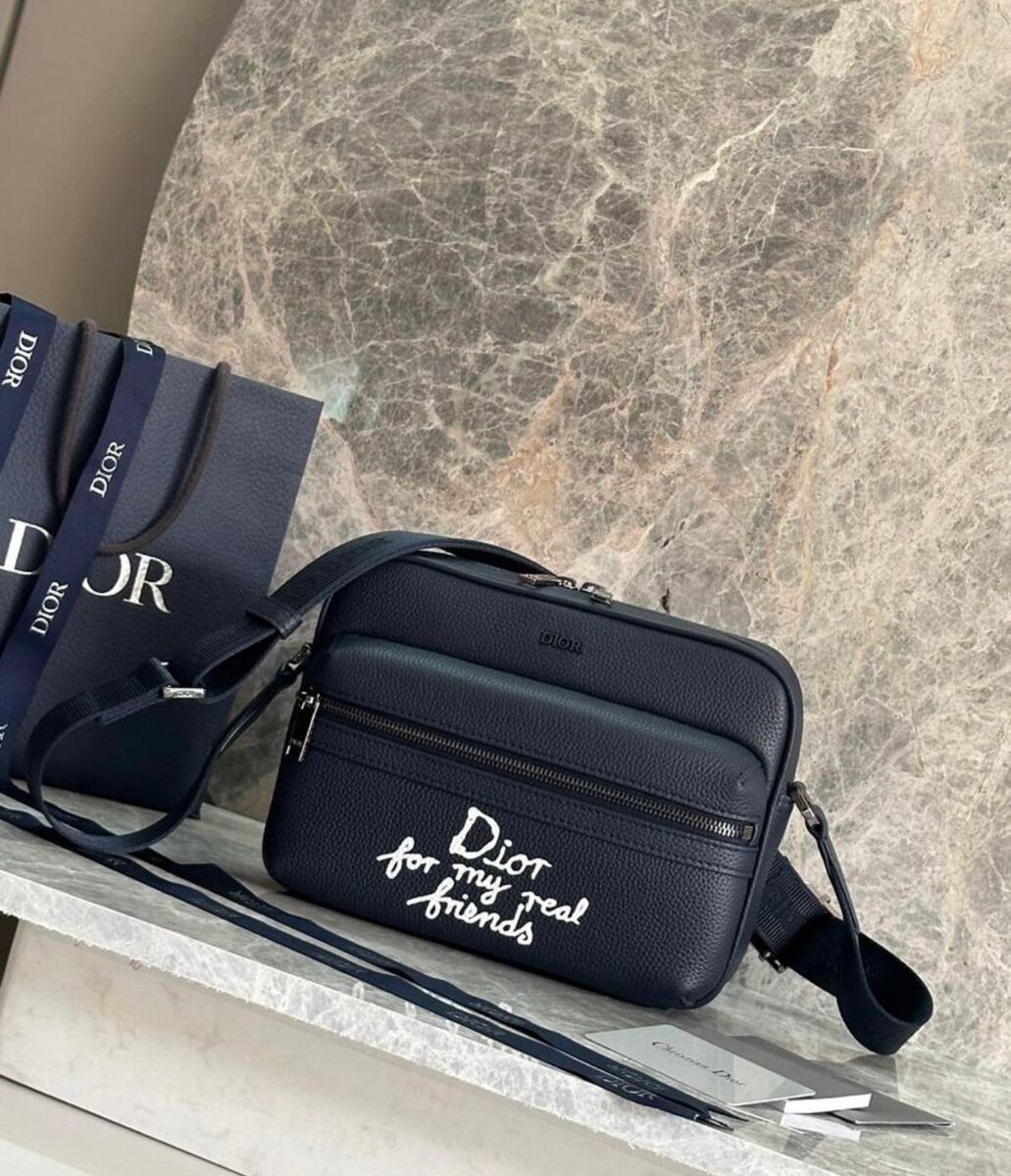 Sacoche Dior en cuir noir pour homme, idéale pour les déplacements quotidiens. Élégante et pratique avec son inscription 'Dior for my real friends'.