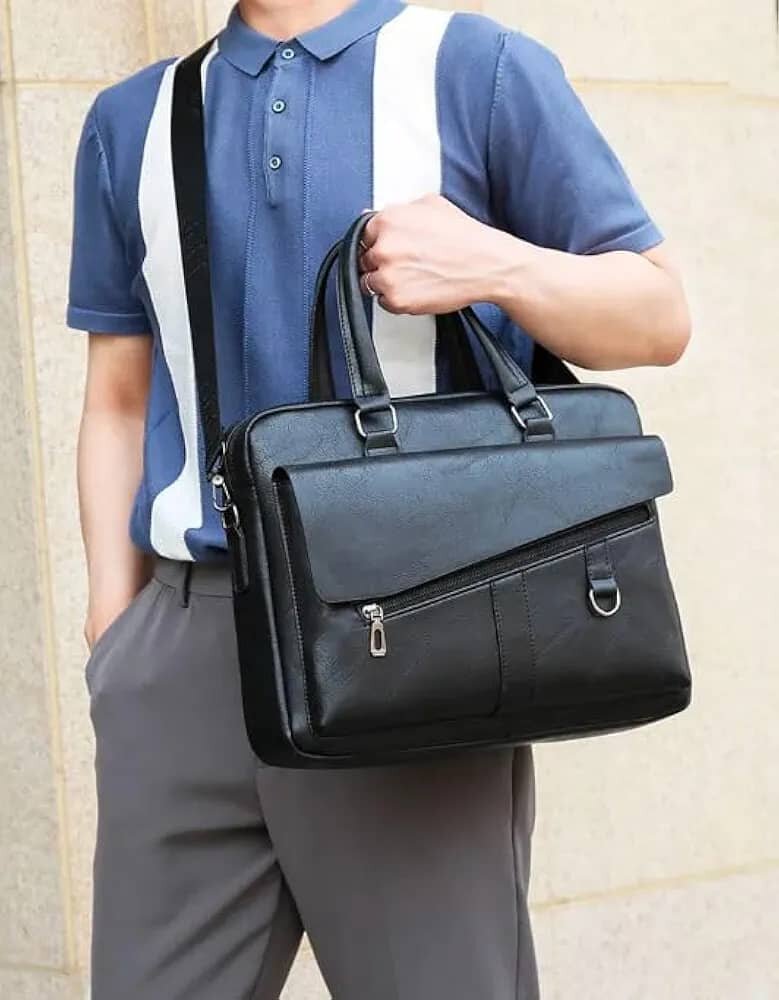 Optez pour cette sacoche en cuir noir, parfaite pour hommes d'affaires modernes. Idéale pour transporter ordinateurs portables, documents et accessoires. Élégante et fonctionnelle, elle dispose de multiples compartiments et d'une sangle ajustable pour un confort optimal. Idéale pour le bureau ou les déplacements professionnels.