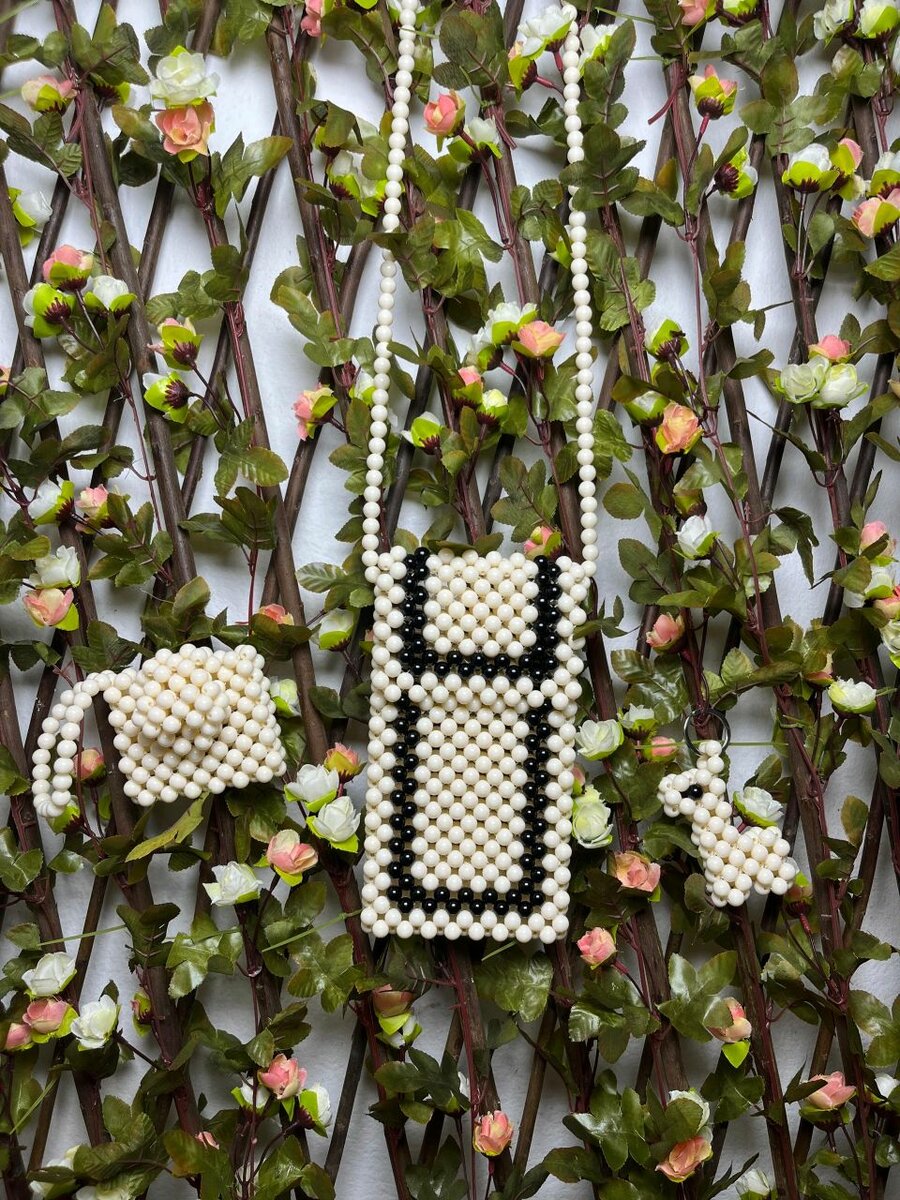 Élégante sacoche en perles blanches et noires, idéale pour transporter votre téléphone en toute sécurité et avec style. Parfaite pour les soirées ou les événements spéciaux.
