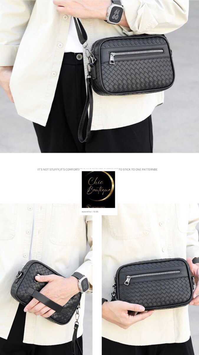 Élégante pochette pour homme en similicuir tressé. Parfaite pour les sorties, elle est pratique et stylée avec un bracelet confortable. Un must-have pour garder vos essentiels à portée de main!