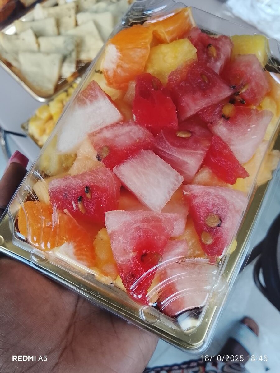 Dégustez une salade de fruits fraîche et colorée, parfaite pour une collation saine à tout moment de la journée. Mélange de pastèque, ananas, et orange, prêt à savourer.