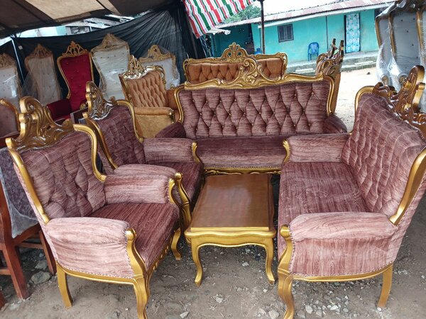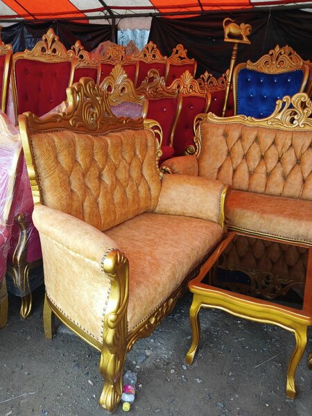 Apportez une touche royale à votre espace avec cet élégant salon en velours doré. Comprend deux canapés et deux fauteuils, parfait pour des salons classiques ou opulents. Construit avec un cadre doré sculpté exquisitement, ce mobilier allie confort et luxe.