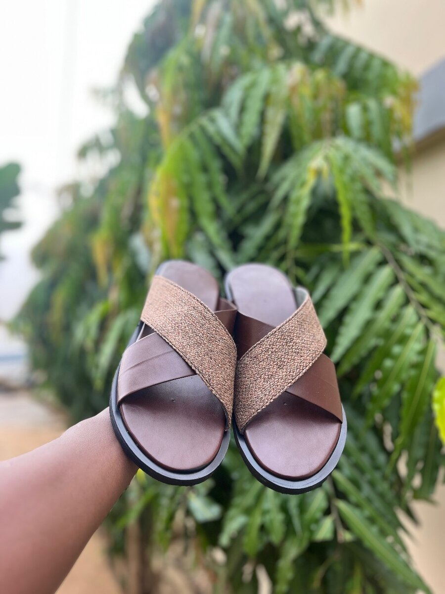 Sandale de couleur marron foncé un mélange de cuir et de raphia de couleur marron idéal sur tout type de vêtement