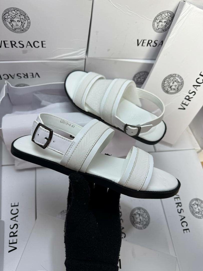Élégantes sandales blanches pour homme de Versace, parfaites pour l'été. Design moderne avec boucle ajustable, offrant confort et style. À porter lors de sorties décontractées ou soirées estivales.