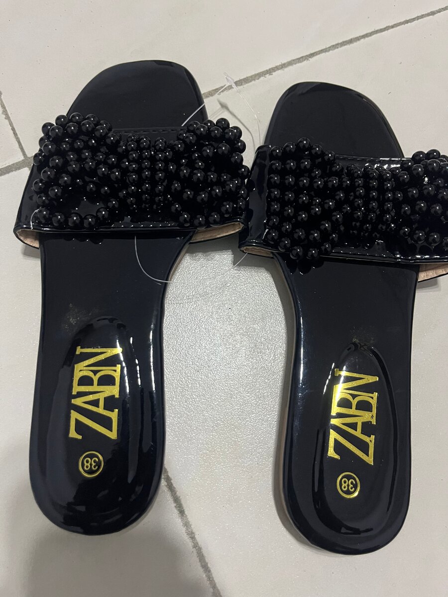 Sandales élégantes avec ornements perlés noirs, parfaites pour un look raffiné. Idéales pour les occasions spéciales ou une tenue décontractée chic. Confortables et tendance, elles complètent parfaitement votre garde-robe.
