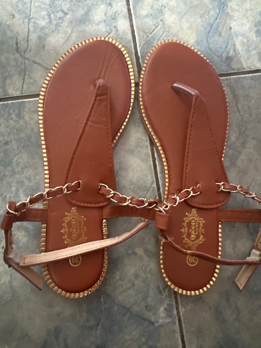Élégantes sandales plates en cuir marron avec chaînes décoratives. Parfaites pour un style estival chic et confortable. Idéales pour la plage ou les sorties décontractées.