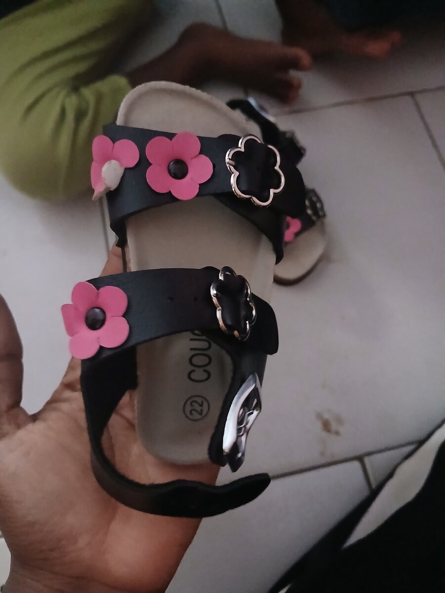 Adorables sandales noires pour enfants avec décor de fleurs roses. Idéales pour les petites fashionistas, ces sandales offrent confort et style pour les sorties estivales. À porter au parc, à la plage ou pour une promenade en ville.