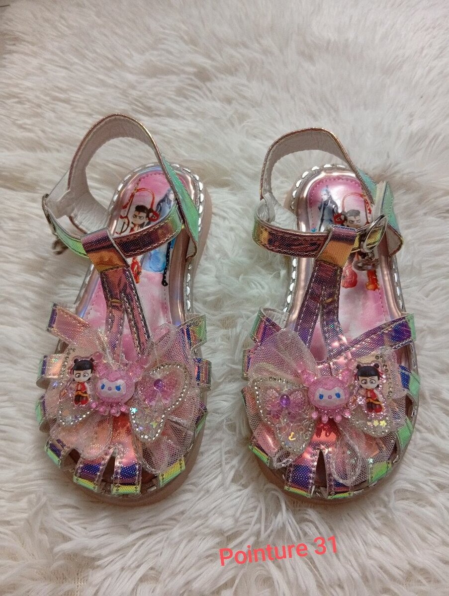 Ces sandales pour enfants, ornées de paillettes et de petits motifs ludiques, sont parfaites pour ajouter une touche de magie à chaque pas. Idéales pour les occasions spéciales ou au quotidien cet été. Taille 31.